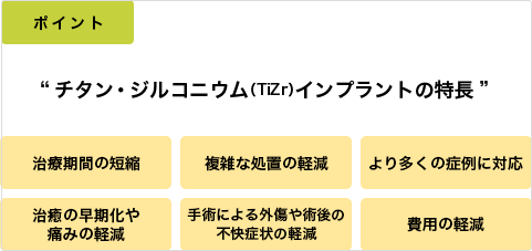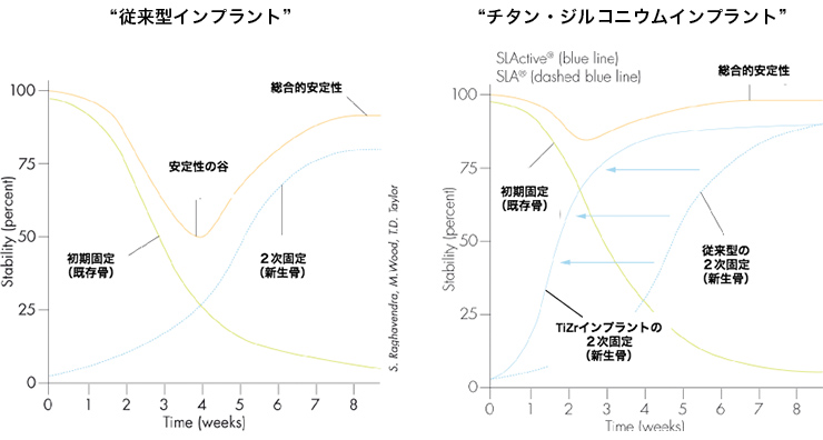 上図でもわかるように、チタン・ジルコニウムインプラントは、術後2週間で安定し、4週間で骨結合が最大化します。ですから、外科的侵襲が少なく、骨結合の早期促進が可能になり、難易度の高い症例でも、より高い予知性を提供することができます。
