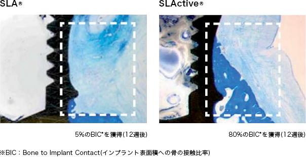 イヌを用いた前臨床研究で、チタン・ジルコニウムインプラントでは従来のインプラントよりも統計学的に優位性を示し、また、成熟した骨の形成を促進することが示されました。